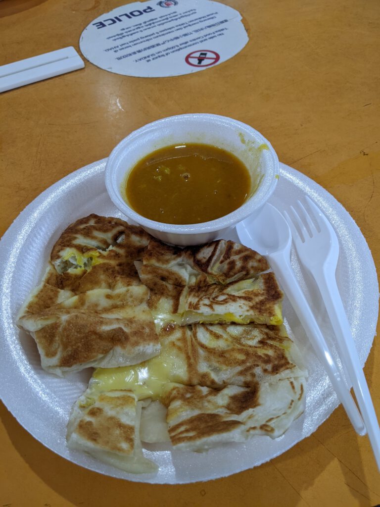 Am Ende Little India’s gab es ein kleines Hawker Center – den Tekka Market. Hawker Center sinf offene Gebäude mit vielen Fast-Food-Ständen , die günstiges Essen anbieten. Dort fand ich auch Prata (eine Art Fladenbrot mit Currysauce) für gerade mal ca. 2,00€. Das Fladenbrot kann auch gefüllt werden, wenn man möchte. Ich habe es mit Käse und Ei gegessen und natürlich mit den Händen. Da nicht so viele Plätze frei waren, kam ich schnell mit einem Mann aus dem Oman ins Gespräch. Er war auch im Urlaub, aber anscheinend ist er nicht das erste Mal in Singapur gewesen.