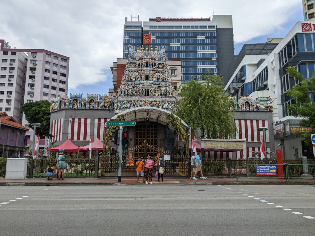 Durch die Zeitverschiebung ist es nicht gerade einfach früh aufzustehen. Nach Deutschland sind es sechs Stunden Unterschied. Heute wollte ich einfach mal ein paar Teile der Stadt erkunden. Mein Hostel liegt in der Nähe von Little India, einem kleinen Stadtteil nordöstlich des Stadtkerns. Ich habe mich wirklich ein bisschen in Indien gefühlt – zumindest so, wie ich es mir vorstelle. Die Menschen trugen meist auch die traditionelle Kleidung wie den Sari (eine Art Gewand) und das Bindi (der rote Punkt auf der Stirn). In der Mitte von Little India lag der Sri Veeramakaliamman Temple, ein bekannter Hindutempel, der von außen aufwendig mit Statuen bestückt ist.